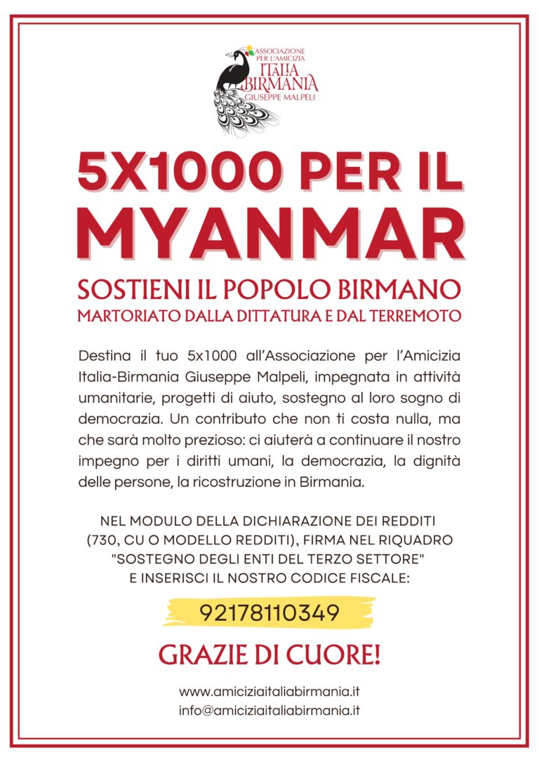 ASSOCIAZIONE PER L’AMICIZIA ITALIA-BIRMANIA GIUSEPPE MALPELI ODVCariparma Ag. 6 IBAN: IT02J0623012706000035930605CAUSALE: “Erogazione liberale Terremoto Myanmar”