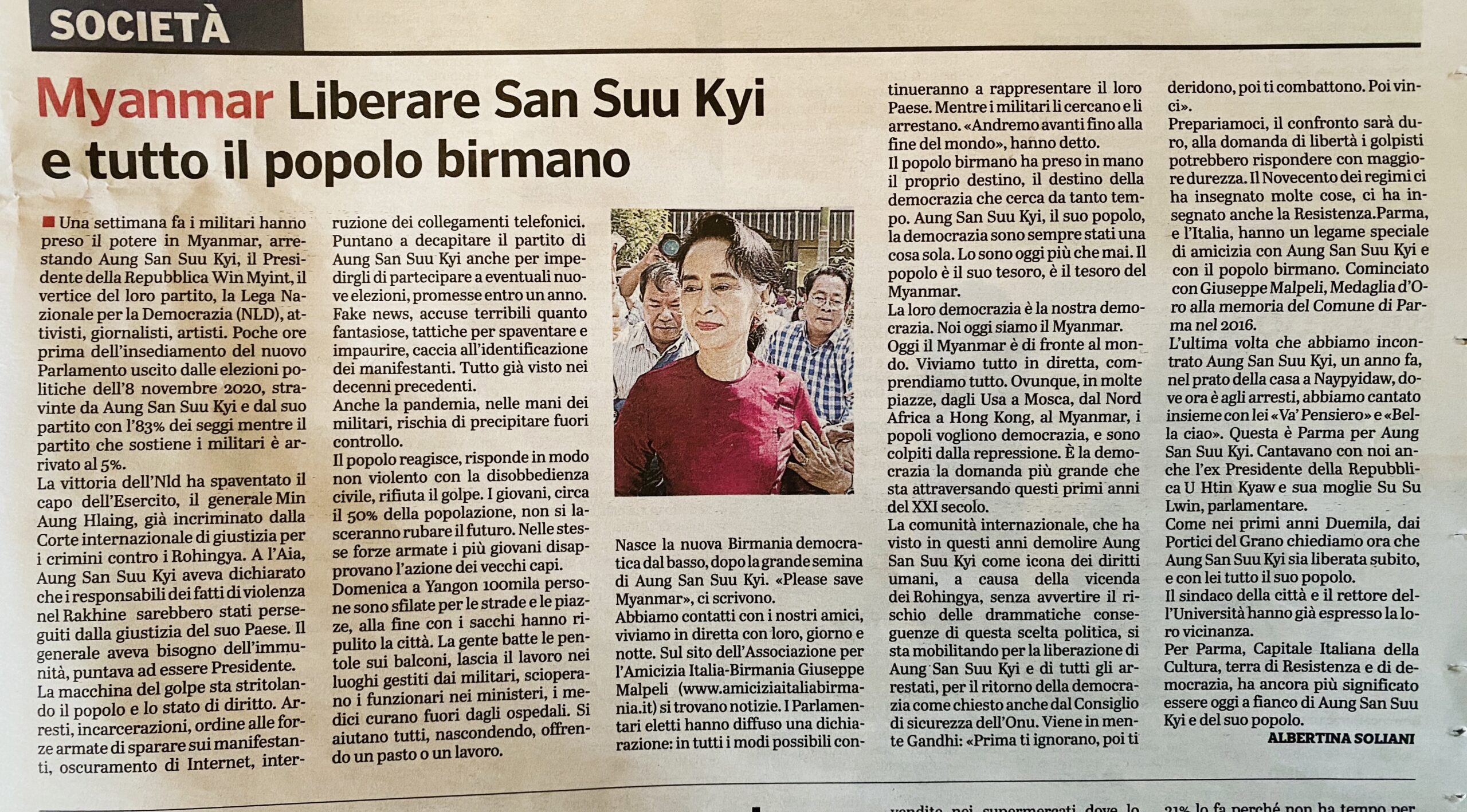 L’ultima volta che abbiamo incontrato Aung San Suu Kyi, un anno fa, nel prato della casa a Naypyidaw, dove ora è agli arresti, abbiamo cantato insieme con lei “Va’ Pensiero” e “Bella ciao”. Questa è Parma per Aung San Suu Kyi. Cantavano con noi anche l’ex Presidente della Repubblica U Htin Kyaw e sua moglie Su Su Lwin, parlamentare.