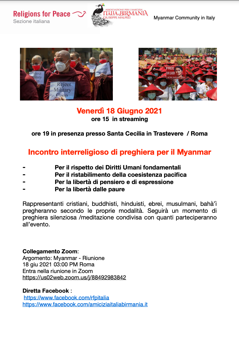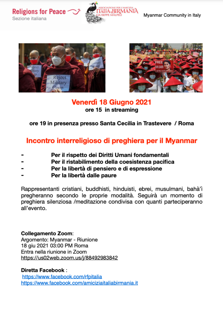 Venerdì 18 giugno 2021 alle 15 sarà trasmesso online l’Incontro interreligioso di preghiera per il Myanmar. In collegamento, visibile su Zoom e in diretta streaming sulle pagine Facebook di Religions For Peace Italia e Associazione per l’Amicizia Italia-Birmania Giuseppe Malpeli, si pregherà insieme per gli amici del Myanmar, insieme alla Comunità dei birmani in Italia.