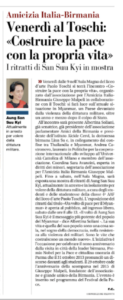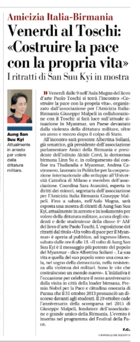 Venerdì 28 ottobre 2022 a partire dalle 9, presso l’Aula Magna del Liceo d’Arte Paolo Toschi di Parma, si terrà l’incontro “Costruire la pace con la propria vita”, organizzato dall’Associazione per l’Amicizia Italia-Birmania Giuseppe Malpeli in collaborazione con il Liceo d’Arte Paolo Toschi: si farà luce sull’attuale situazione in Myanmar, un Paese ancora devastato dalla violenza della dittatura militare, oltre un anno e mezzo dopo il colpo di Stato, con testimonianze e voci della resistenza civile.