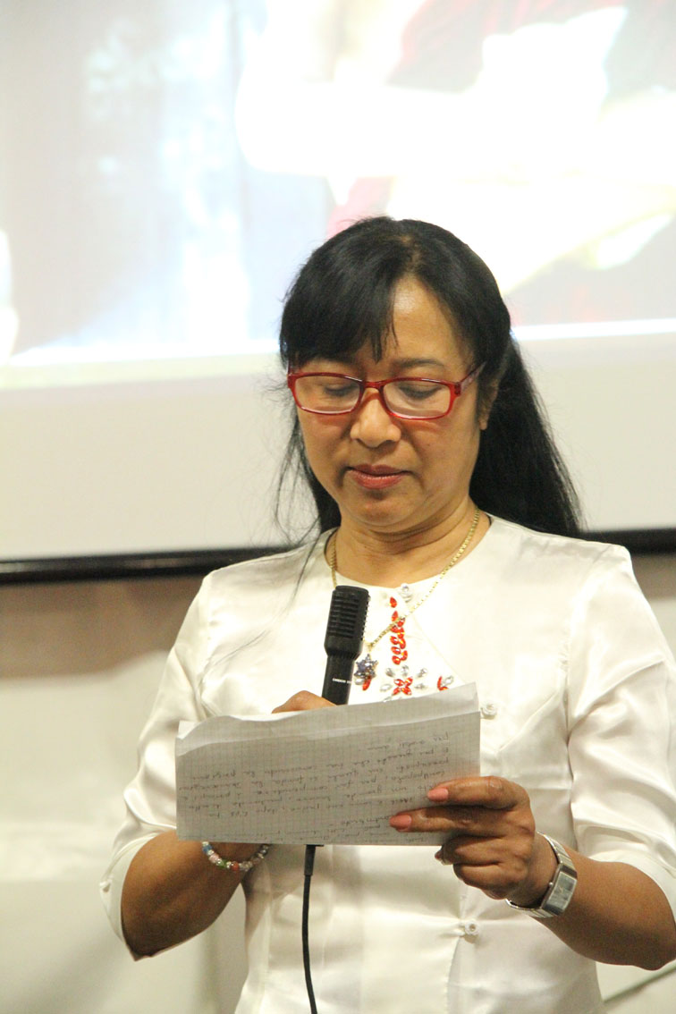 Una serata conviviale per fare gli auguri di buon compleanno ad Aung San Suu Kyi, Premio Nobel per la Pace e cittadina onoraria di Parma organizzata dall’Associazione per l’Amicizia Italia-Birmania. Molte le persone presenti, anche amici birmani, mercoledì 18 giugno presso la Comunità Betania di Marore. Numerosi anche gli interventi, i progetti di lavoro nel campo dell’istruzione, della sanità e dell’agricoltura presentati nel corso della serata. Un momento di dialogo sulla democrazia in Birmania e in Italia che ha messo in luce l’impegno di Aung San Suu Kyi per cambiare la Costituzione e per un’autentica democrazia nel suo Paese. Al dialogo presentato da Fabrizia Dalcò, si sono uniti don Luigi Valentini della Comunità Betania, Gabriele Ferrari, consigliere regionale dell’Emilia Romagna, Mario De Blasi, presidente del consiglio provinciale di Parma. Molto gradita la presenza di Giuseppe Malpeli, ancora cpnvalescente, e l’importante intervento di Albertina Soliani che ha illustrato la situazione attuale del paese, invitando tutti i presenti a fare un brindisi di auguri ad Aung San Suu Kyi e a tutta la Birmania. La cara Amica We, ha letto alcune poesie in birmano.