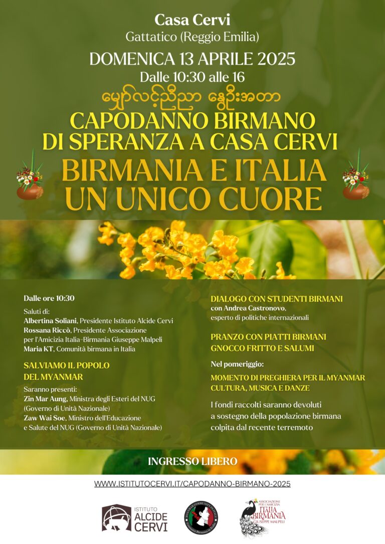 L’incontro inizierà alle 10,30, con i saluti di Albertina Soliani, Presidente dell’Istituto Alcide Cervi, Rossana Riccò, Presidente dell’Associazione per l’Amicizia Italia-Birmania Giuseppe Malpeli e Maria KT, rappresentante della Comunità birmana in Italia. A seguire interverranno due Ministri del Governo di Unità Nazionale (NUG) del Myanmar, costituito dai parlamentari democraticamente eletti nel 2020, ora in esilio: Zin Mar Aung, Ministra degli Esteri, e Zaw Wai Soe, Ministro dell’Educazione e della Salute. Infine, alcuni giovani birmani, che studiano all’Università di Parma dialogheranno con Andrea Castronovo, esperto di politiche internazionali e volontario in Myanmar.