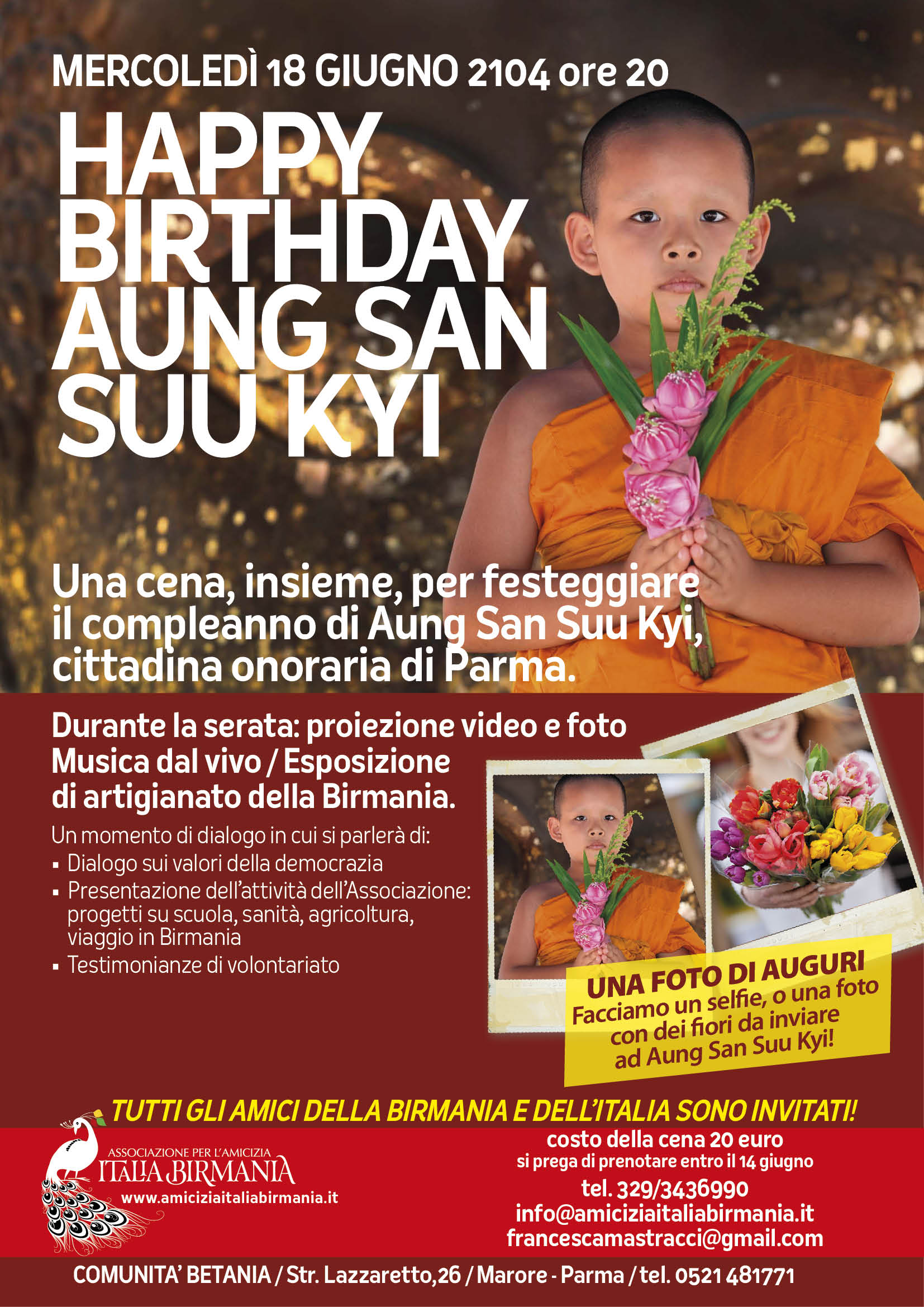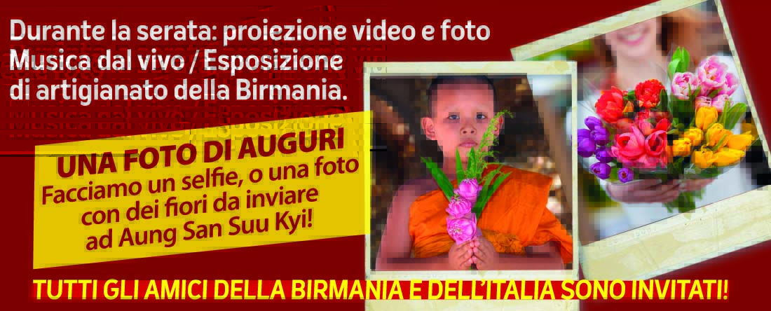 Durante la serata: Proiezione video e foto / Musica dal vivo / Esposizione di artigianato della Birmania.