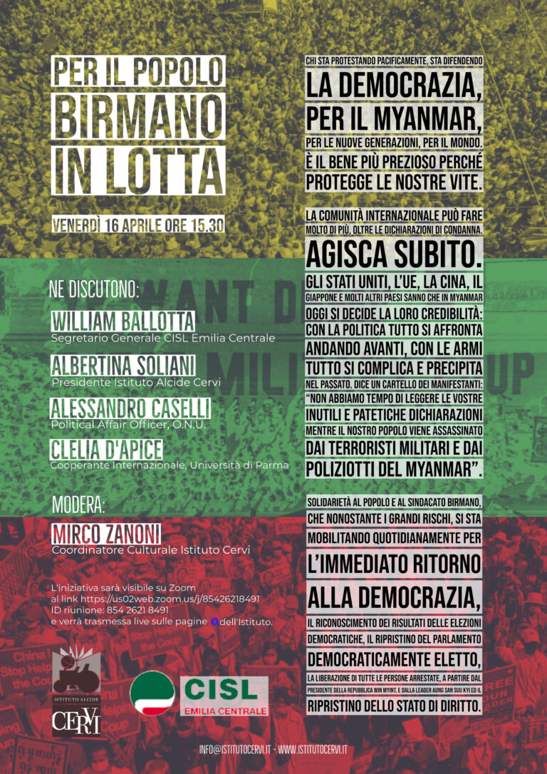 Venerdì 16 aprile alle 15.30 si terrà l’incontro online Per il popolo birmano in lotta, organizzato dall’Istituto Alcide Cervi e da Cisl Emilia Centrale. Tema di questo dibattito sono gli ultimi avvenimenti in Myanmar, dove le repressioni violente dei militari contro il popolo, contrario alla dittatura seguita al golpe del 1° febbraio scorso e all’arresto del Consigliere di Stato Aung San Suu Kyi, hanno causato centinaia di morti. Al dibattito parteciperanno William Ballotta (Segretario Generale CISL Emilia Centrale), Albertina Soliani (Presidente dell’Istituto Alcide Cervi), Alessandro Caselli (Political Affair Officer dell’ONU) e Clelia D’Apice (Cooperante internazionale, Università di Parma; membro dell’Associazione per l’Amicizia Italia-Birmania). Modera l’incontro Mirco Zanoni.