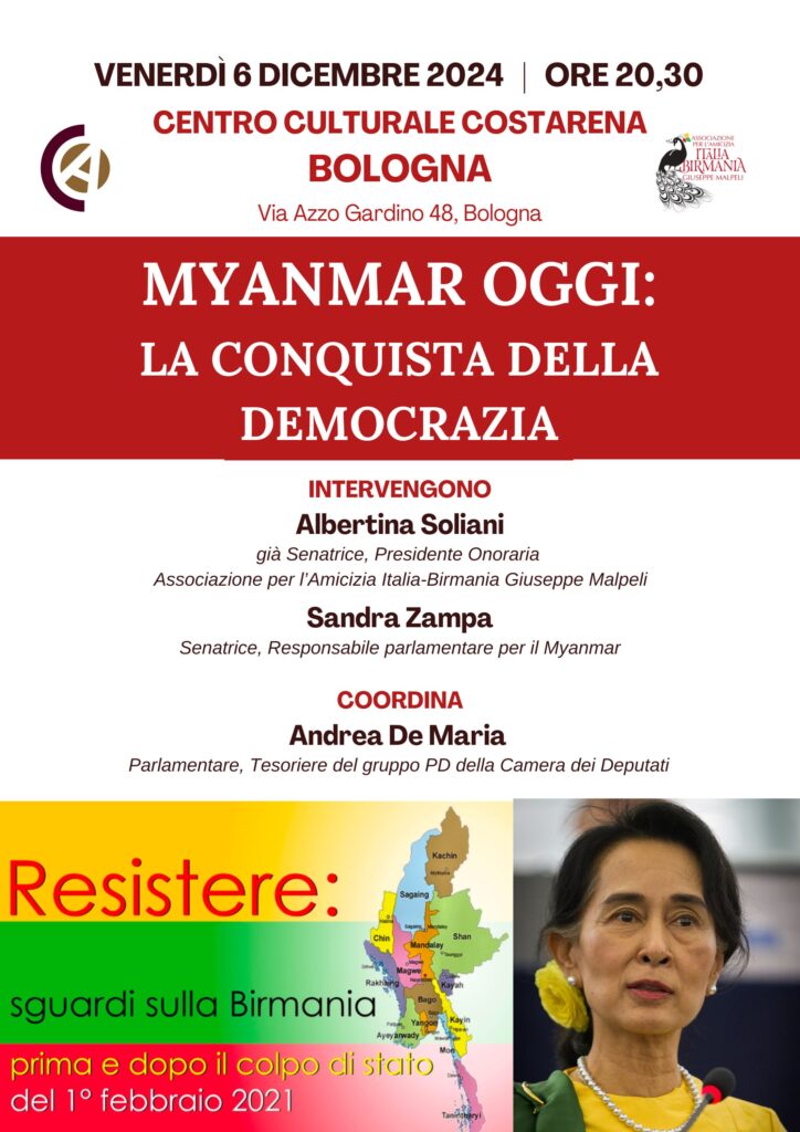 Un incontro per parlare del Myanmar. Venerdì 6 dicembre dalle 20,30 a Bologna, presso il Centro Culturale CostArena in via Azzo Gardino 48, si terrà il dibattito “Myanmar oggi: la conquista della democrazia”, con gli interventi della già senatrice Albertina Soliani, Presidente onoraria dell’Associazione per l’Amicizia Italia-Birmania Giuseppe Malpeli, e della senatrice Sandra Zampa, responsabile parlamentare per il Myanmar. Coordinerà il dibattito Andrea De Maria, deputato Pd.