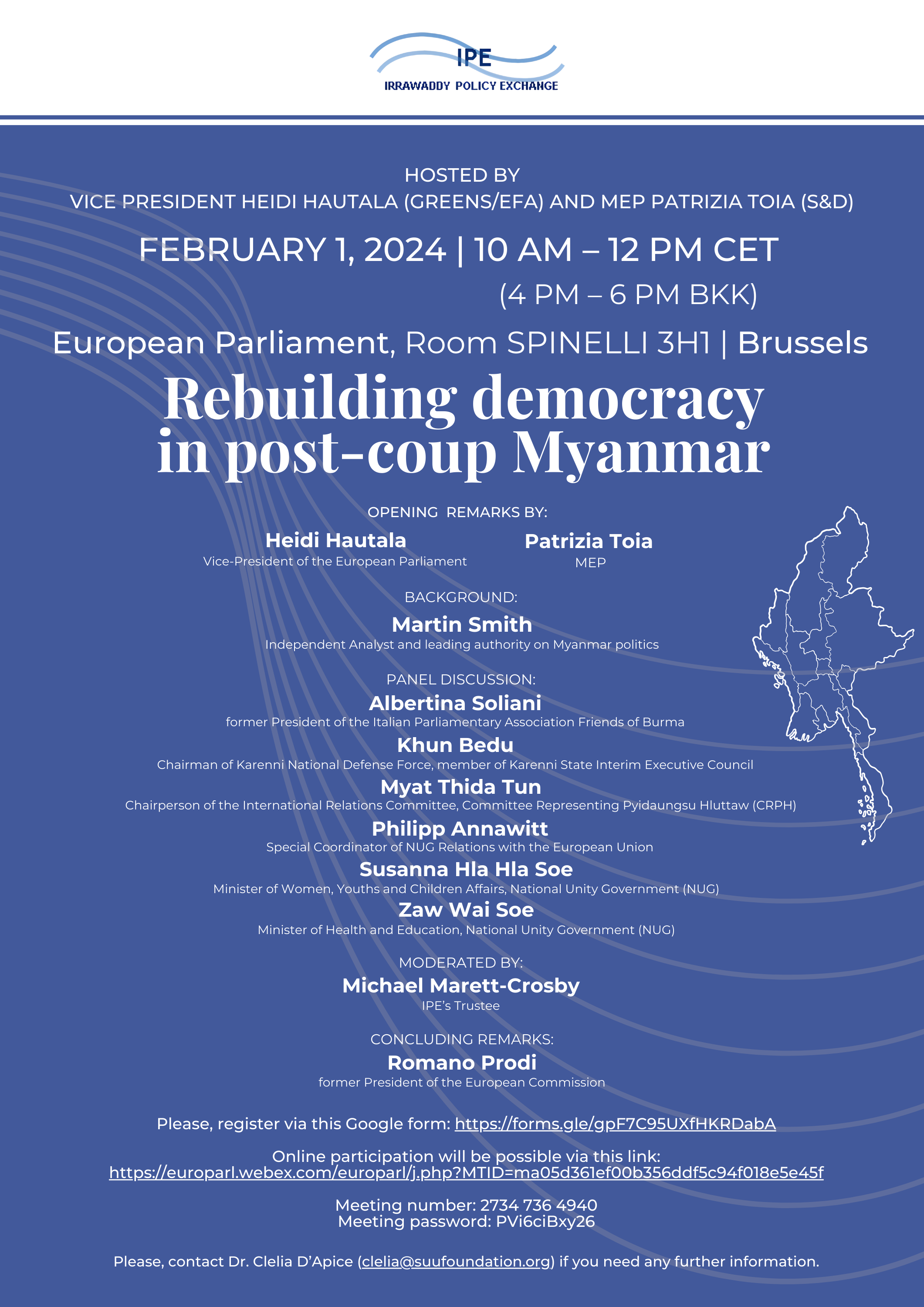 Incontri e iniziative, Iniziative Rebuilding democracy in post-coup Myanmar January 30, 2024 / 0 Comments Intervento di Albertina Soliani a due questioni poste COMUNICATO STAMPA Share on Facebook Share Share on TwitterTweet Share on Pinterest Share Share on LinkedIn Share Send email Mail