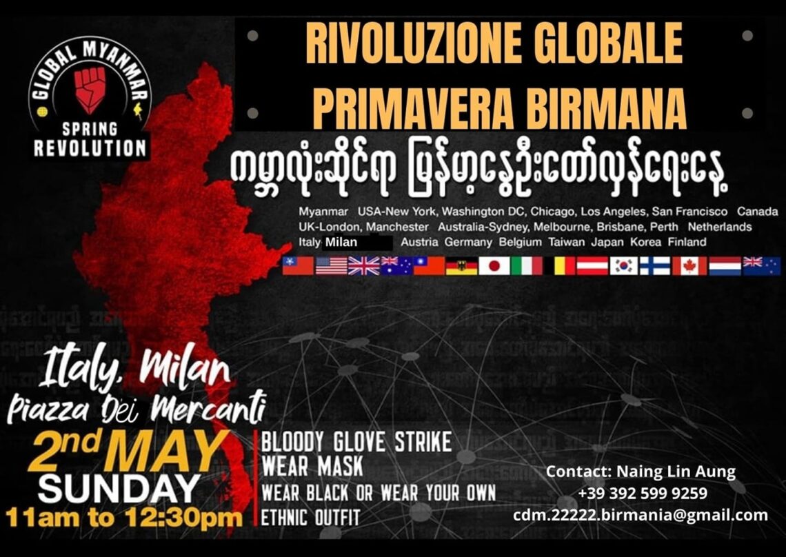 Ecco i video e le immagini della manifestazione milanese di Rivoluzione globale. Primavera birmana. L’iniziativa si è svolta il 2 maggio 2021 in città di tutto il mondo, organizzata dalle comunità birmane di vari Paesi, a sostegno della popolazione del Myanmar in seguito al golpe militare del febbraio scorso.